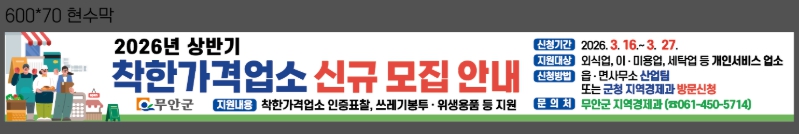 신청 대상은 무안군에서 실제 운영 중인 외식업, 세탁업, 이·미용업, 숙박업 등 개인서비스 업종이다.