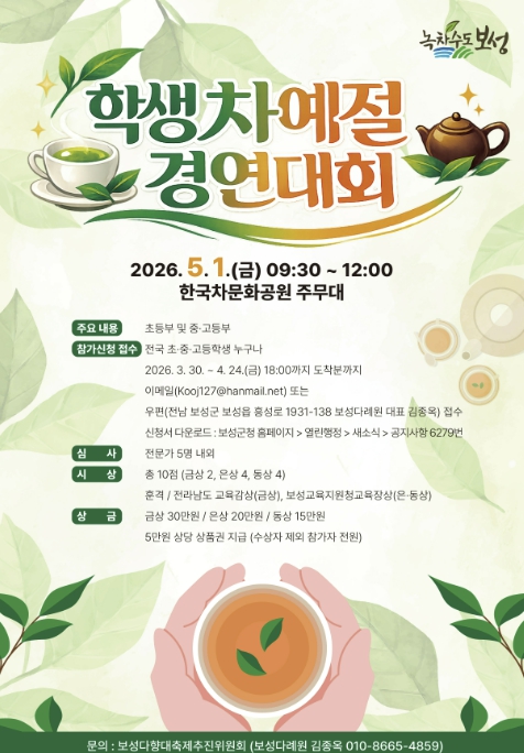 보성다향대축제추진위원회 서상균 추진위원장은 “이번 경연대회는 청소년들이 전통 차 문화를 직접 체험하고 예절의 가치를 배울 수 있는 뜻깊은 자리”라며 “전국 학생들의 많은 관심과 참여를 기대한다”고 전했다.