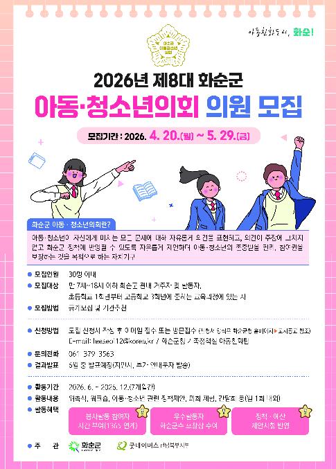 2026년 제8대 화순군 아동·청소년의회 의원 모집 홍보 포스터