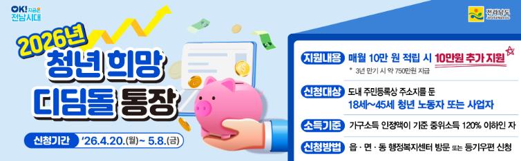 윤연화 전남도 인구청년이민국장은 “청년 희망디딤돌 통장은 일하는 청년이 안정적으로 목돈을 마련하도록 돕는 대표적 자산형성 정책”이라며 “앞으로도 청년의 지역 정착과 자립을 지원하는 맞춤형 정책을 지속해서 확대하겠다”고 말했다.