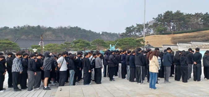 3일 국립5‧18민주묘지에서 광산중학교 2‧3학년 학생 160여 명이 참배하고 있다.